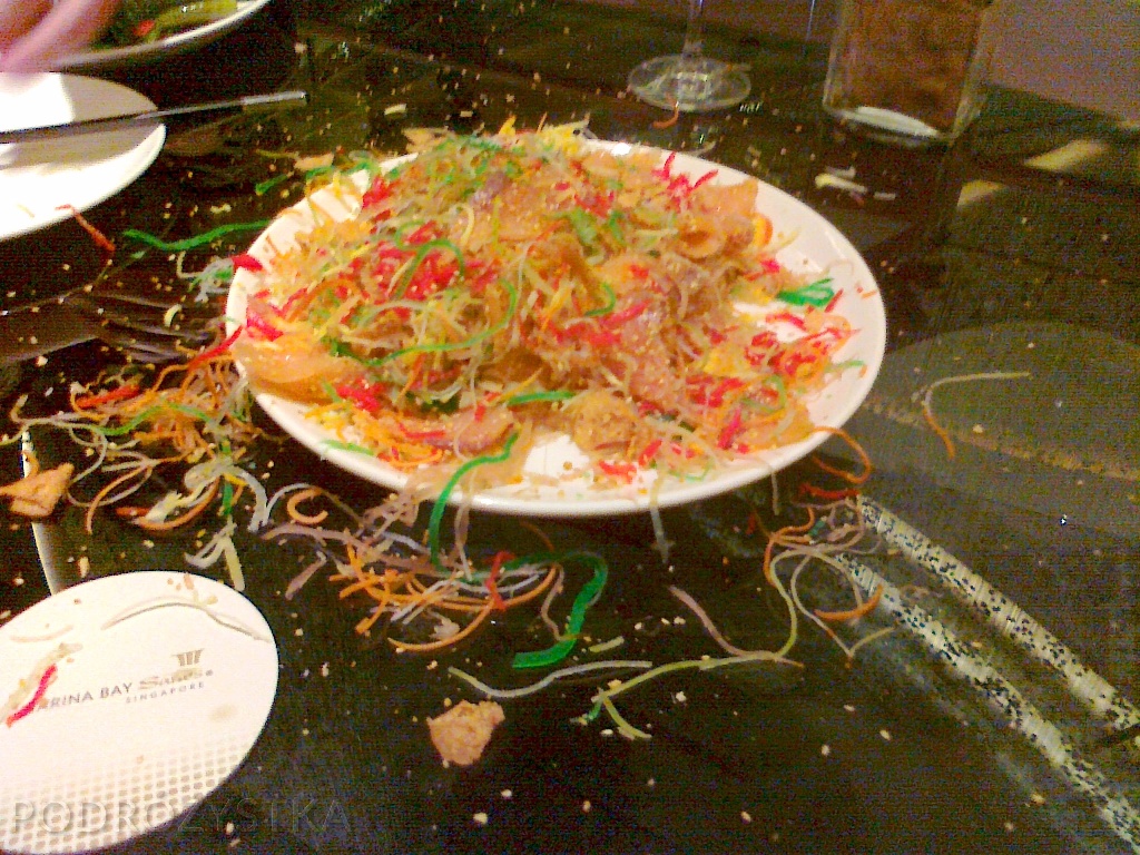 Najważniejszym dniem jest wigilia Nowego Roku, czyli odpowiednik Sylwestra. Przede wszystkim nie powinno się zakładać w ten dzień starych ubrań, bo z bogactwa nici – wszystko musi być nówka sztuka, a wieczorem kolacja, fajerwerki i bębny po północy obwieszczające nadejście nowego. Tradycyjną potrawą podawaną podczas tej celebracji jest Yu Sheng zwany też Lo-Hei! Składnikami są: surowa ryba (głównie łosoś, który osiąga wtedy zawrotne ceny), poszatkowana rzodkiew, barwiona na kilka kolorów, marchewka, sos śliwkowy, pokruszone orzeszki ziemne, pomelo, specjalne, kruszone krakersy, sezam, odrobina oliwy. Każdy z tych elementów ma swoje znaczenie, wszystkie kręcą się głównie w koło bogactwa, powodzenia i wiecznej młodości. Jak tak czytam, co jest tam namieszane, to brzmi strasznie – a wygląda właśnie tak: