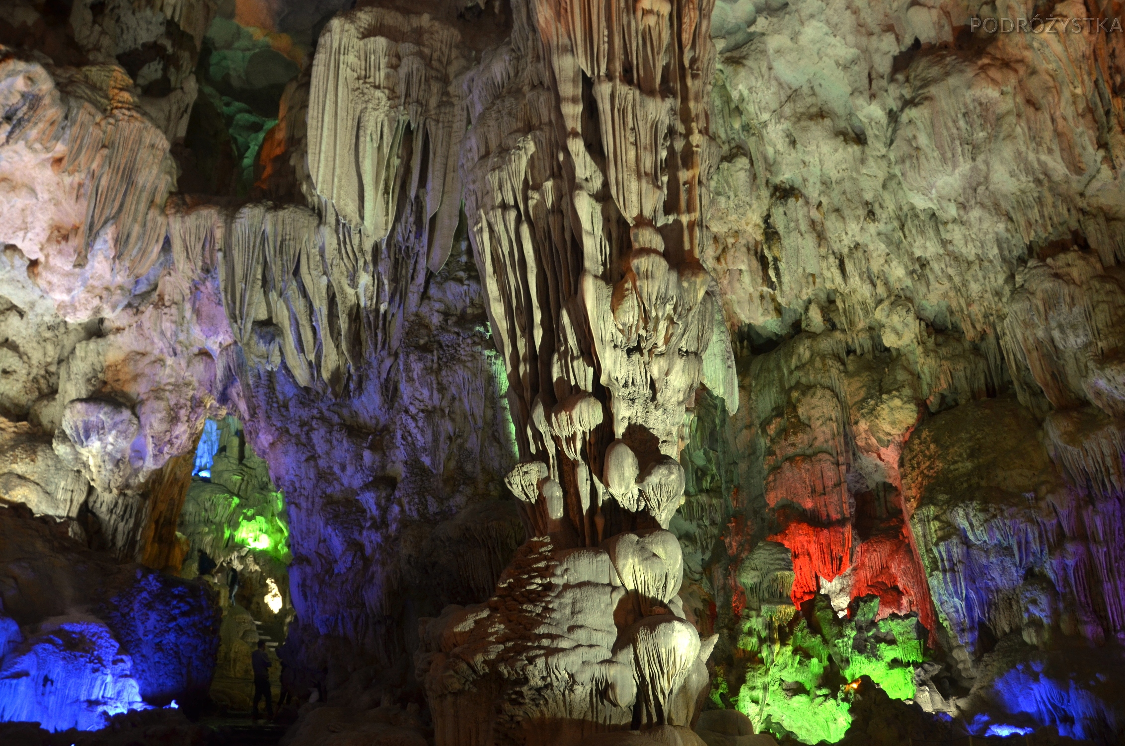 Halong Bay to nie tylko skały i wysepki, ale także jaskinie. Odwiedziliśmy jedną z nich (Thien Cung Cave) i wrażenia pozostaną niezapomniane, niestety nie za sprawą stalagmitów i stalaktytów, ale kolorowych światełek, absolutnie psujących nastrój i klimat tego miejsca.