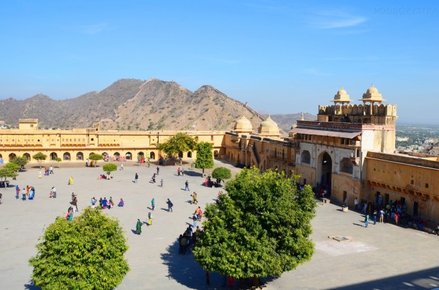Łapiemy rikszę do Amber (Amer) Fort (nazwa fort i pałac jest często używana zamiennie – wiele budowli to po prostu pałace w forcie) i zanurzamy się w 45-minutowe wycia silnika. Ten XVII-wieczny fort znajduje się na wysokim wzgórzu, kawałek za miastem. Historia Indii jest dla mnie wciąż bardzo zawiła, mamy jednak tu do czynienia z Radźputanami (Rajput) – hinduskimi klanami rycerskimi. Wciąż są to czasy panowania Mogołów, w których Akbar, powierzył te tereny zwierzchnictwu swojego zaufanemu wojownikowi radży Man Singh I i pierwsze kształty fortu, który możemy podziwiać obecnie, zostały powołane do życia.