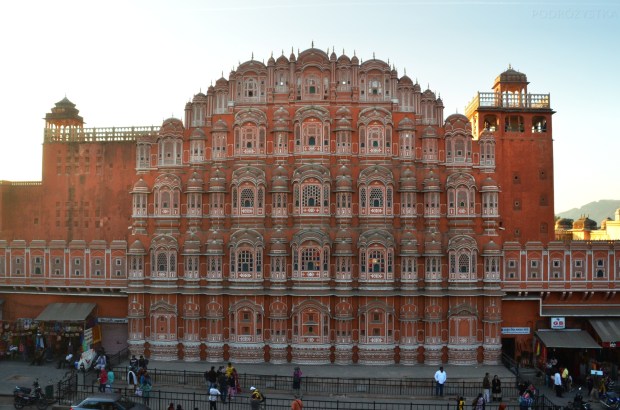 Wyskakujemy z rikszy w historycznym centrum miasta – pink city, różowe miasto. Nazwa nieprzypadkowa – wszystkie budynki prezentują się w tym cukierkowym kolorze. Wszystko przez to, że wieki temu jeden Maharadża chciał udowodnić wizytującemu księciu jakim to pięknym miastem zarządza, nakazał więc wymalować wszystko na różowo. Zdaje się, że nie zrobiłam ani jednego zdjęcia.. Bynajmniej nie przez moją niechęć do tej barwy. Byliśmy w pośpiechu, szybkim krokiem przemierzając bazarowe ulice starego miasta do ostatniej atrakcji – Hawa Mahal. Ten znajdujący się w centrum pałac, został ukończony w ostatnim roku XVIII wieku. Ciekawa fasada, inspirowana koroną boga Kriszny, umożliwiała kobietom z rodziny królewskiej obserwowanie parad ulicznych i codziennego życia, pozostając niezauważonymi. Nie było już możliwości wejścia do środka obiektu – za późno. Stanęliśmy na ulicy na przeciwko, usiłując objąć te 5 wspaniałych pięter w obiektywie, kiedy pojawił się mężczyzna zapraszając nas po schodach na górę, by zrobić lepsze zdjęcie. Początkowo sceptyczni podążyliśmy jednak za nim. Istotnie, z tarasu cały obiekt mieścił się idealnie. Oczywiście nic za darmo, więc zaproszenie łączyło się z odwiedzeniem znajdującego się na piętrze sklepu z biżuterią. Grzecznie rzuciliśmy okiem i wyszliśmy (bez żadnych zakupów).