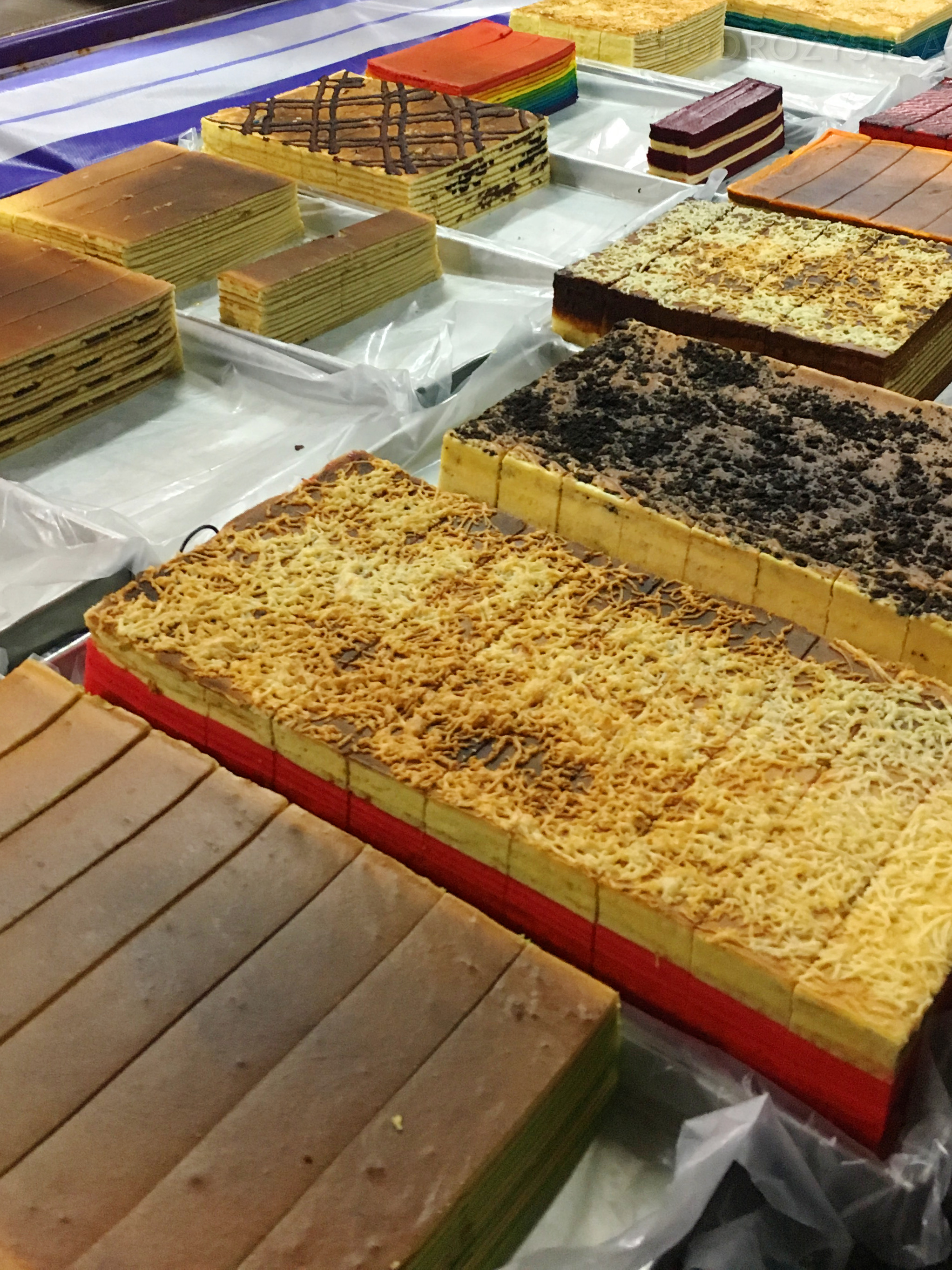 Na wieczorny spacer po Kuching, o którym pisać zaczęłam już tutaj, wybraliśmy się nabrzeżem rzeki Sarawak. Turystycznie przygotowana, deptakowa ścieżka, z gdzieniegdzie obecnymi straganami, nadaje się na przechadzkę idealnie. Skusiły nas budki z ciastem Lapis (ang. Layer; warstwa), sprzedawanym na paski. Często kolorowe, złożone ze ściśle przylegających warstw cienkiego, mokrego biszkoptu ze smakowymi aromatami. Pycha!