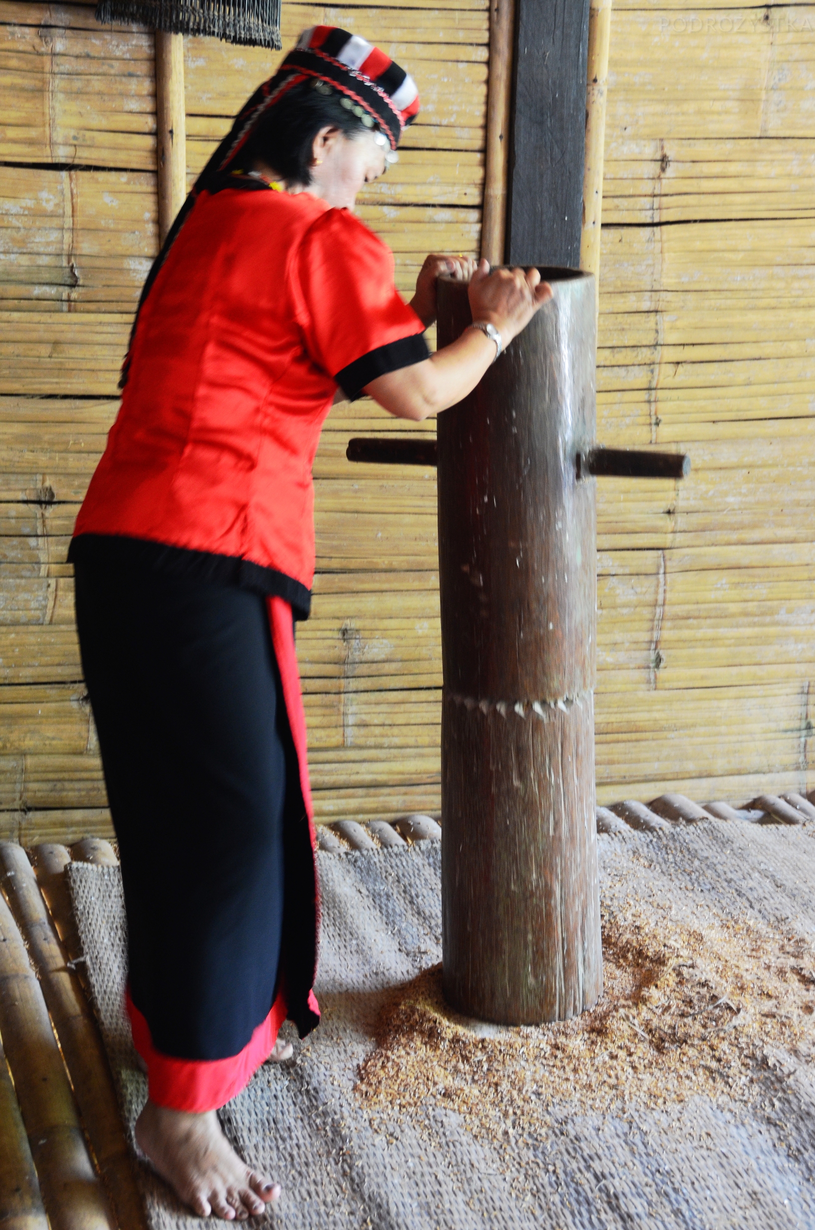 Malezja, wyspa Borneo, Sarawak, Cultural Village, przedstawicielka plemienia Bidayuh miele ziarna ryżu