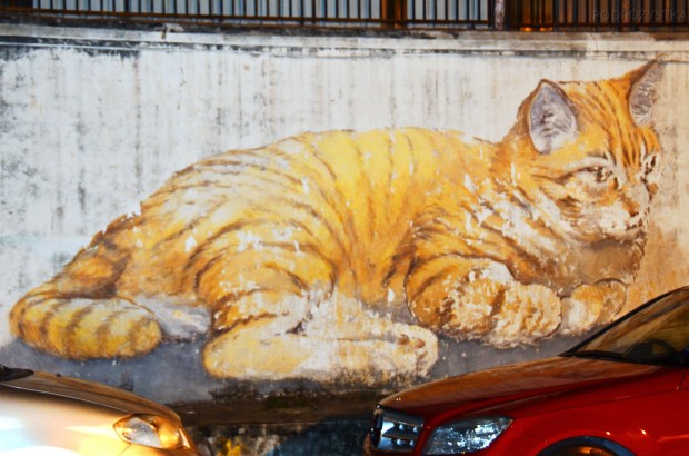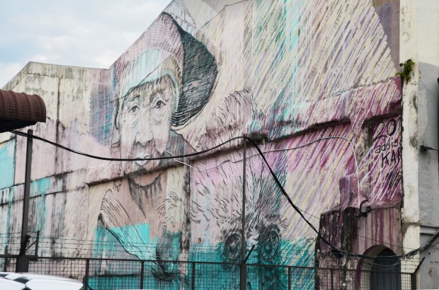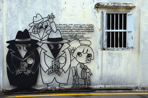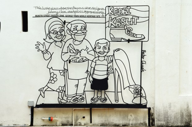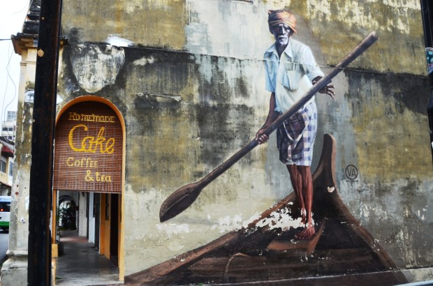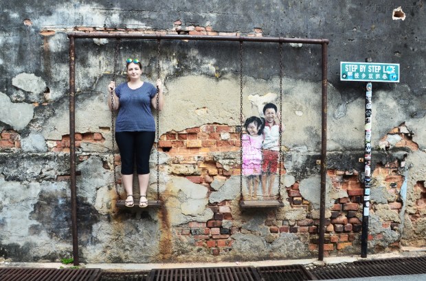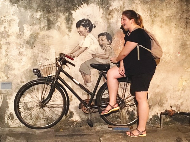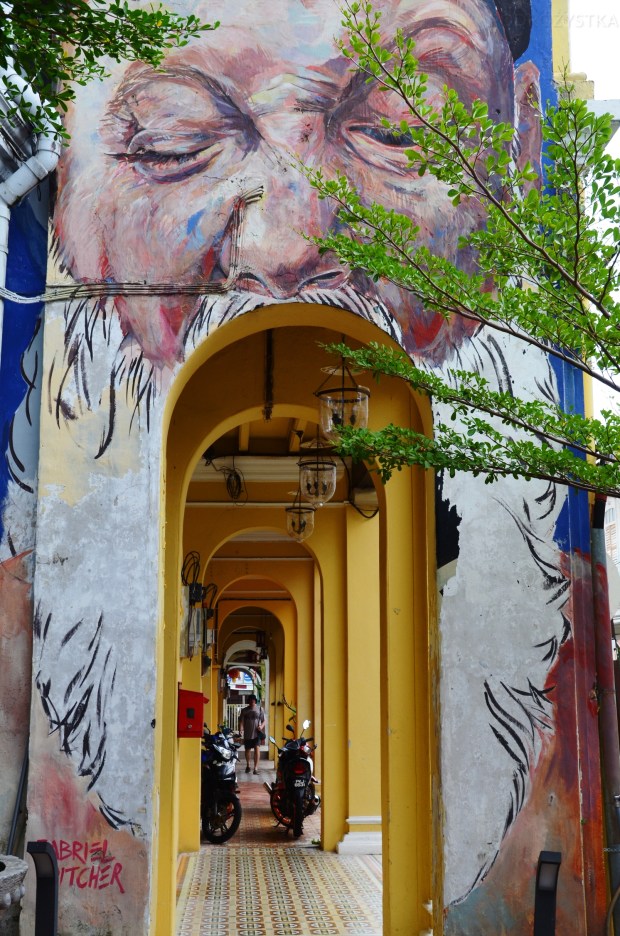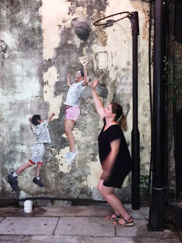 Chociaż Penang to stolica kulinarna Malezji, my byłyśmy szczęśliwe.. nie jedząc. Zamiast tego kolejny kierowca Graba podrzucił nas z powrotem do centrum i rozpoczęłyśmy długi spacer wzdłuż ścian, szukając murali, które opanowały ulice Georgetown w wyniku konkursu lokalnych władz 10 lat wcześniej, a obecnie sztuka ta żyje własnym życiem, pokrywając coraz większą ilość ulic. Podczas gdy stare, pochodzące z początkowego okresu, powoli niszczeją, nowe zdają się pojawiać jak grzyby po deszczu. Coraz trudniej jest też wyśledzić, kto był ich autorem – pozostaje więc podziwiać, wchodzić w interakcje i pstrykać fotki dla utrwalenia. Podczas poprzedniej wizyty nie natrafiłam na poniższe: