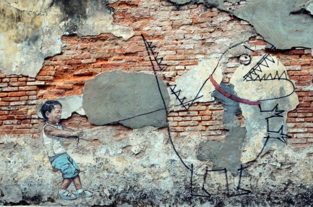 Malezja, wyspa Penang, George Town, E. Zacharevic: Little Boy with Pet Dinosaur (Mały chłopiec z dinozaurem)